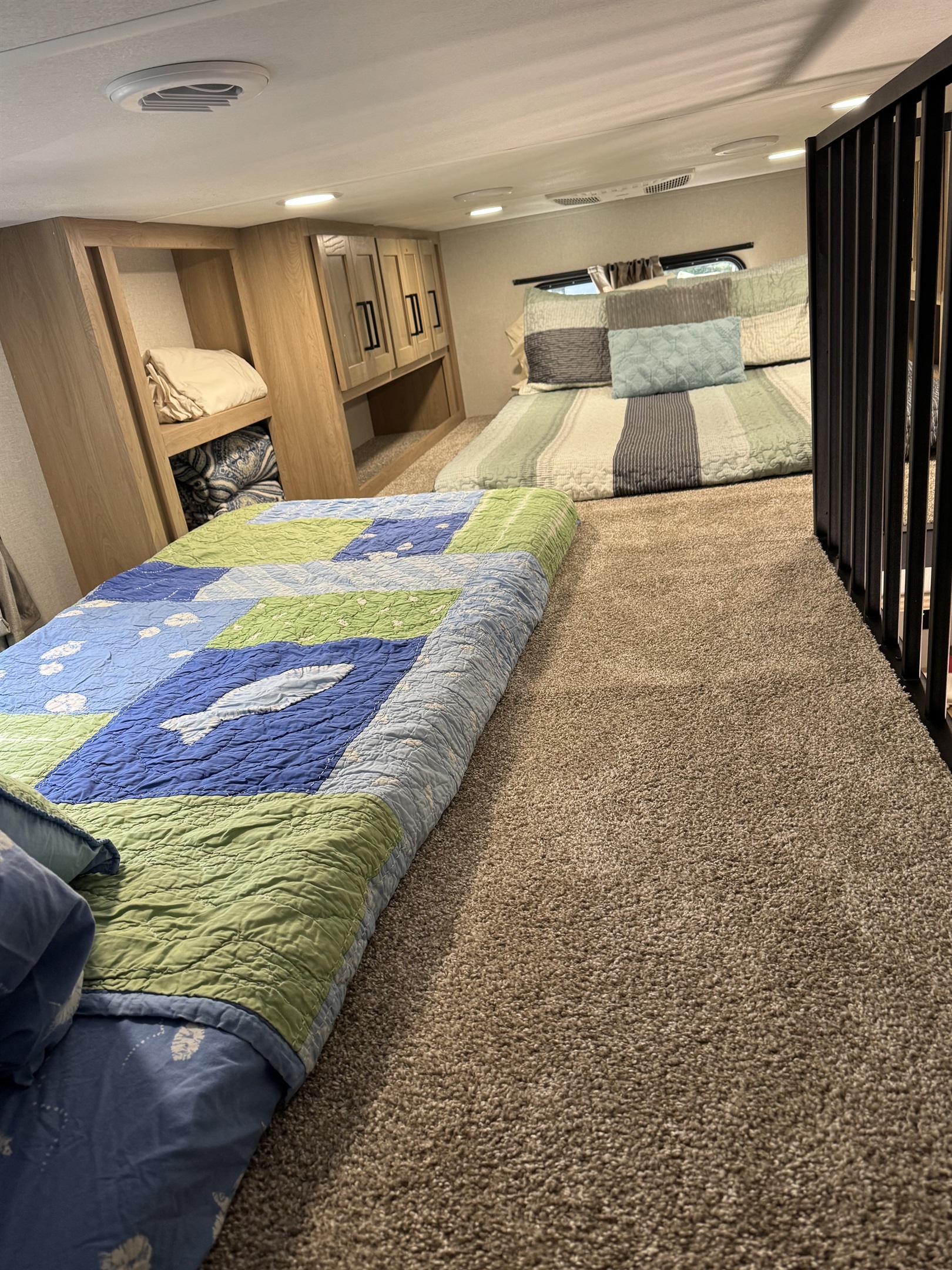 4 Bedrooms • 2 Bathrooms (1 full, 1 half) 2 Baths (1 full, 1 half) • Sleeps 1-9This on-site Luxury RV comes TURN-KEY and sleeps 9 Just bring your family and food! Enjoy a CUSTOM Tiki Bar with outdoor kitchen (grill and outdoor refrigerator), plenty of seating and entertaining area as well as a fire pit area. There are two Master Bedrooms with queen beds and one has an en-suite bathroom. There are four rooms total in this rv. The other three all have queens and one has an additional twin bed all with three inch sleeper toppers for comfort. . The living area and kitchen are both well appointed with plenty of seating.